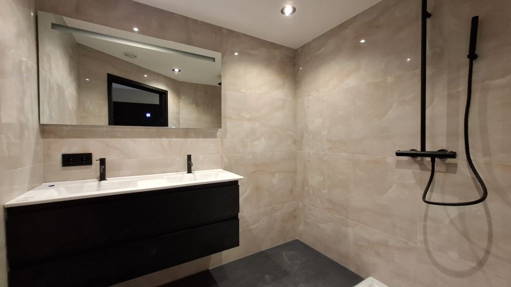 Als laatste but not least, de ruime badkamer met een dubbele wasbak, prachtige spiegel en een ruime inloopdouche.