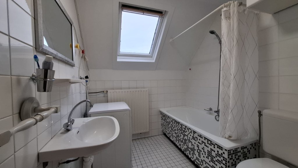 Door de grote raampartijen is er veel natuurlijk lichtinval. Het gaat hier dan ook om een doorzonwoning. De open keuken is opgesteld in een hoek. De keuken is al wat ouder maar er is net een nieuw gasstel in geplaatst. Verder staat er een grote koel/vries combinatie, Ook is er een inbouw oven, een losse magnetron, afzuigkap en voldoende kastruimte. Ook laat de verhuurder het nodige glaswerk en keukenmateriaal achter waarvan gebruik gemaakt mag worden. En anders bent u natuurlijk vrij om dit op te bergen op zolder als u liever uw eigen spullen wilt gebruiken.