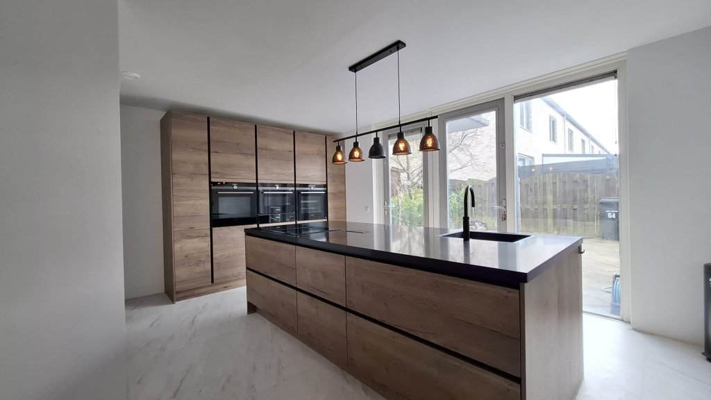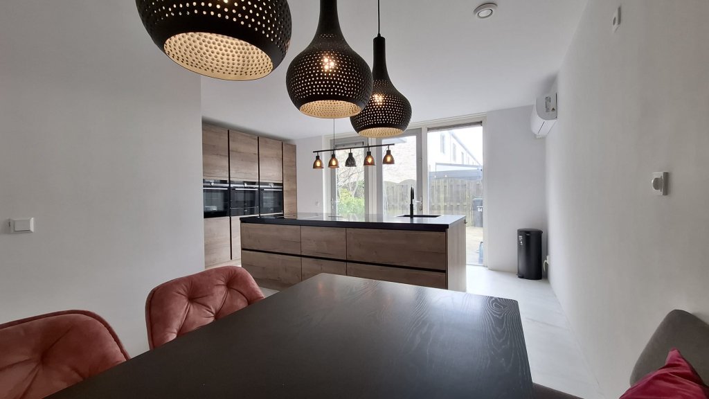Vanuit de woonkamer kun je via een vaste trap naar beneden, waar zich een aparte toilet bevindt en ook de ruime moderne keuken. Het grote kookeiland is echt een must voor de kookliefhebber. En omdat hier tevens de eethoek is opgesteld, kun je hier heerlijk koken voor familie en vrienden terwijl je toch gelijk een gezellig glaasje met elkaar kunt nuttigen. De keuken is van alle gemakken voorzien. Aparte oven en een aparte magnetron maar ook een stoomoven. Veel opbergruimte. Ook het glaswerk en borden, bestek is aanwezig.