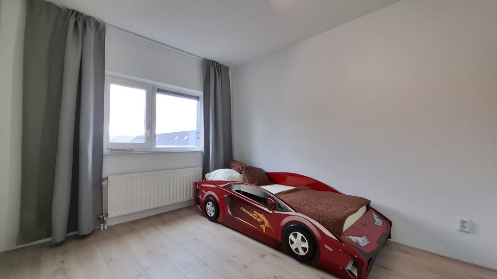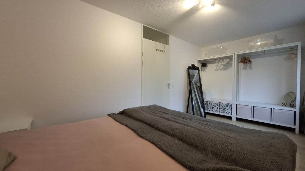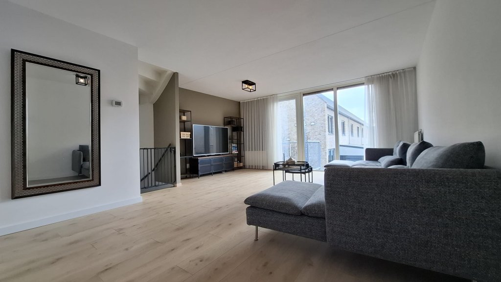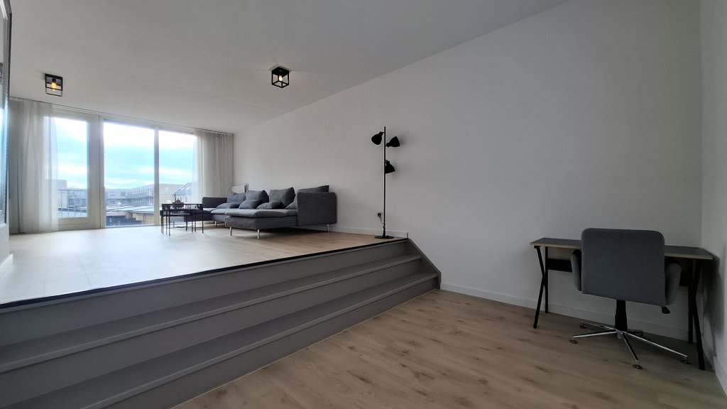 De woonkamer is ingericht met een grote relaxbank en een moderne kastopstelling waar een grote tv is geplaatst. Verder is er voldoende ruimte om bijvoorbeeld in het lager gelegen gedeelte een speelhoek te creëren of een kantoortje. Er is ook een bureau en stoel beschikbaar zoals ook op de foto's te zien is. De woonkamer beschikt ook over een klein balkon dat bereikbaar is via de openslaande deur.