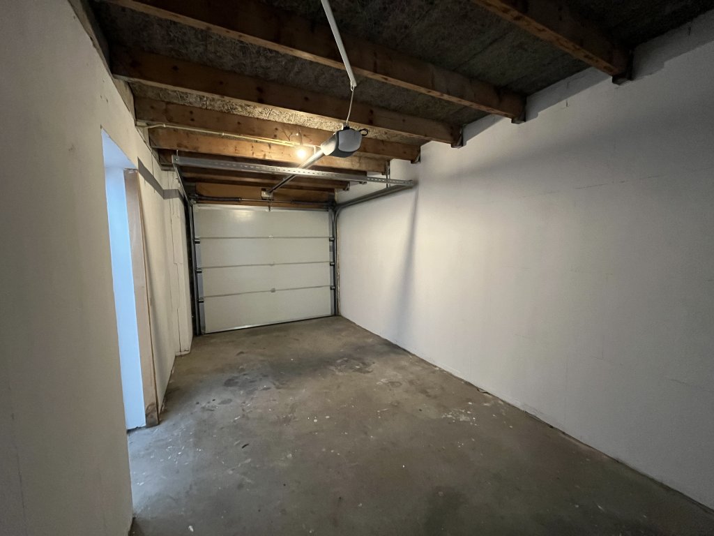 Hal met toilet, trapopgang en deur naar de inpandige garage. Toegang tot grote woonkamer met aan de voorzijde het eetgedeelte met de halfopen keuken en aan de achterzijde het woongedeelte met tuindeur.