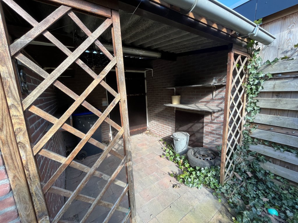 Diepe achtertuin met overdekt terras, stenen berging en achterom.