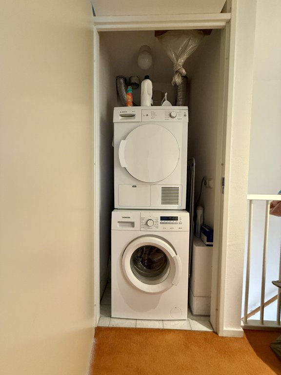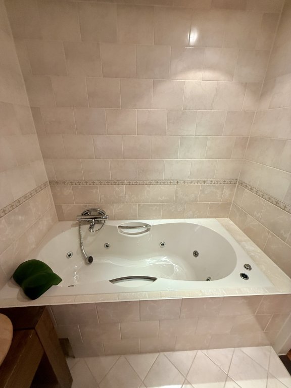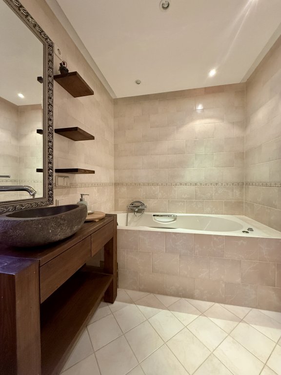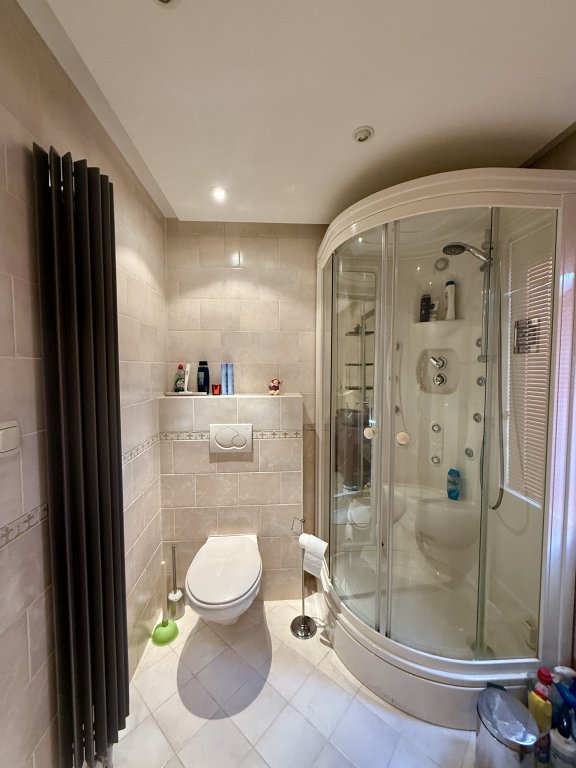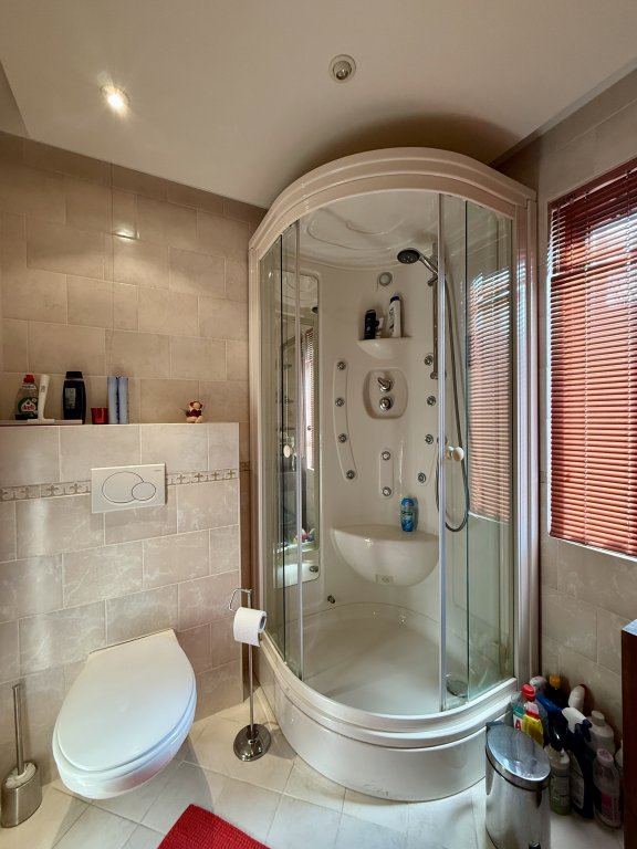 De badkamer is ruim opgezet, volledig betegeld en uitgevoerd in een warme, tijdloze kleurstelling. De ruimte beschikt over zowel een luxe douchecabine met massagejets als een comfortabel ligbad met whirlpoolfunctie, ideaal om te ontspannen na een lange werkdag.