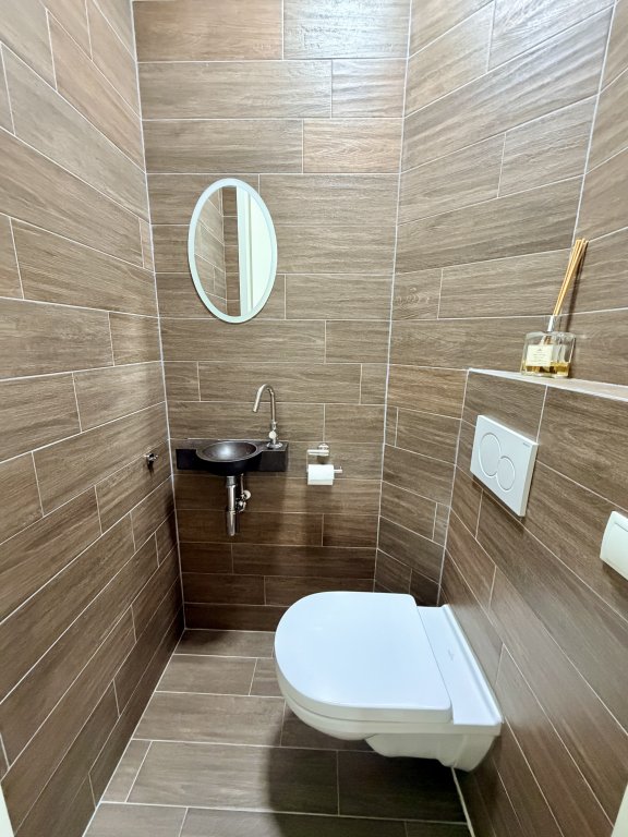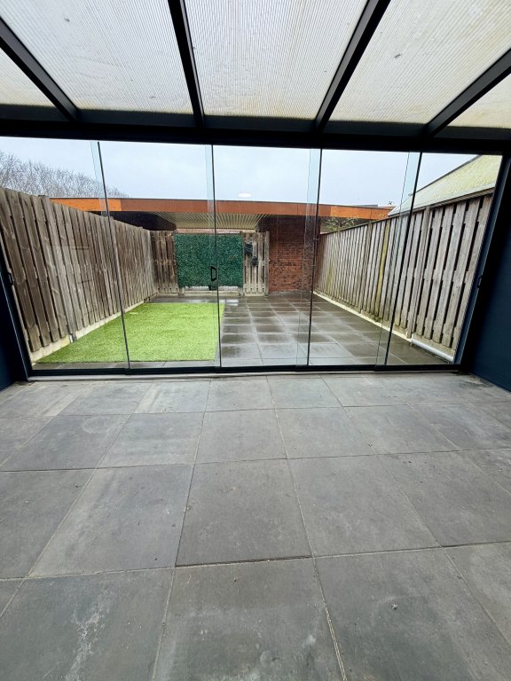 Nette hal met ruim toilet. Living met ruimte voor zithoek, aan de andere zijde is een groot opgezette keuken met inductiekookplaat, Bosch koelkast, vaatwasser, oven-combi en vriezer. met ruimte voor een diningset. Via een glazen terrasoverkapping met schuifwand geraak je in de tuin. Deze is laag in onderhoudt en ideaal voor de kinderen om in te spelen. Er is een externe, stenen berging met elektra. Alsook een overdekte carport voor 1 auto. Via een externe poort kun je hier inrijden.