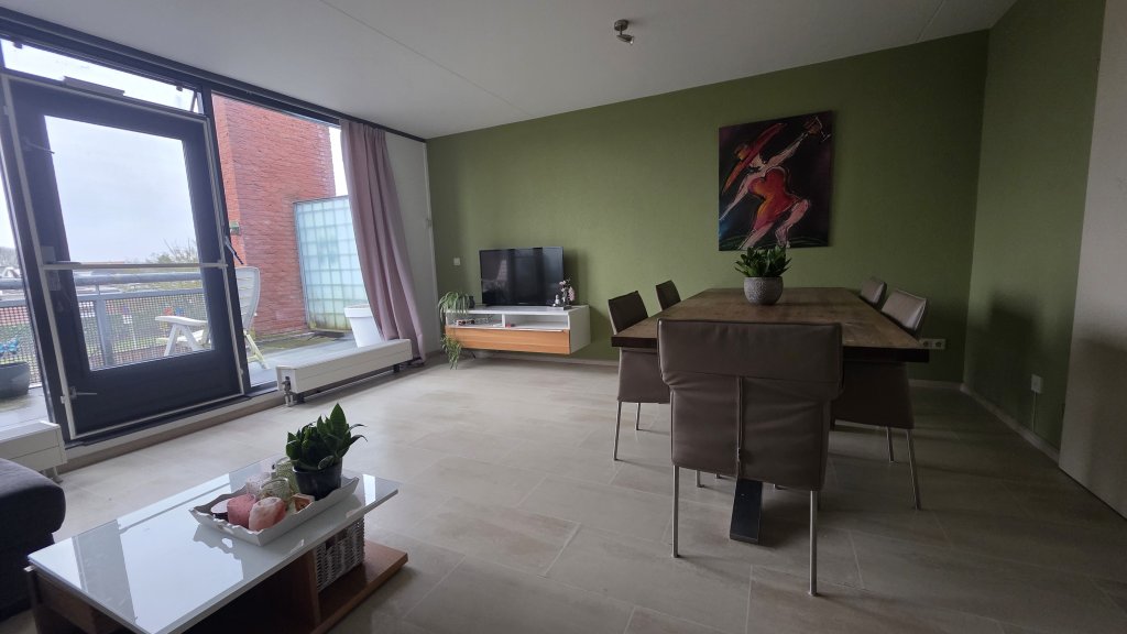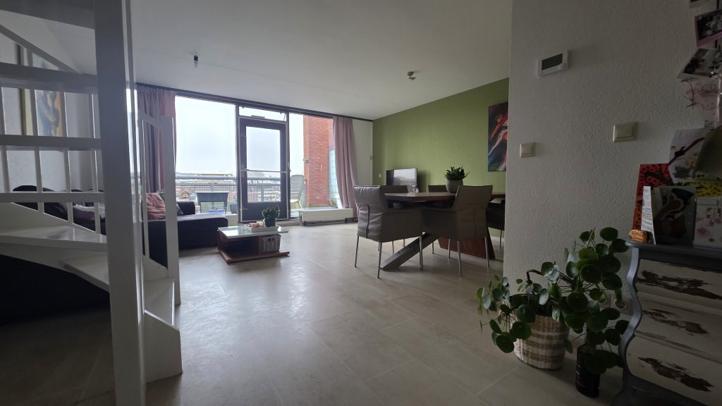 Bij binnenkomst leidt een langgestrekte hal naar het toilet, de badkamer en de technische ruimte. Aan het einde van deze hal bevindt zich de riante, lichte woonkamer met open keuken. Deze royale leefruimte vormt het hart van de woning en biedt directe toegang tot het dakterras van circa 16 m² — een fijne plek om buiten te zitten en te genieten van de ruimte en privacy.