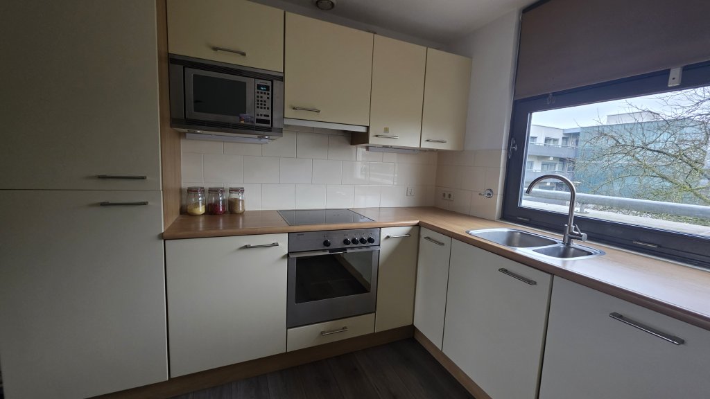 De keuken is in L-vorm opgesteld in is van alle voornaamste gemakken voorzien. Zo beschik de keuken o.a. over een vaatwasser en een combi-oven.