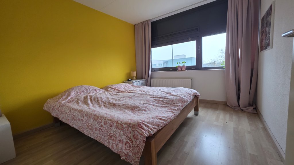 Twee slaapkamers liggen aan de zijde van het binnenplein en bieden uitzicht op het pleintje, terwijl de grotere slaapkamer aan de straatzijde is gelegen. De centraal gesitueerde badkamer is voorzien van een douche en een wasmeubel. Tevens bevinden zich hier de aansluitingen voor een wasmachine en droger.