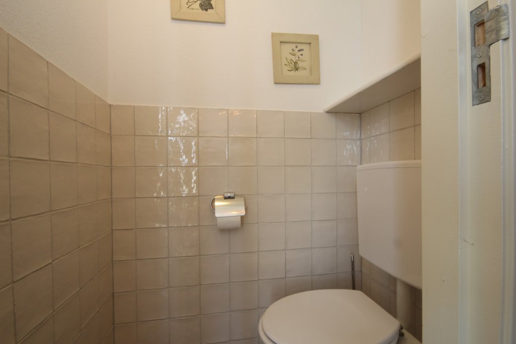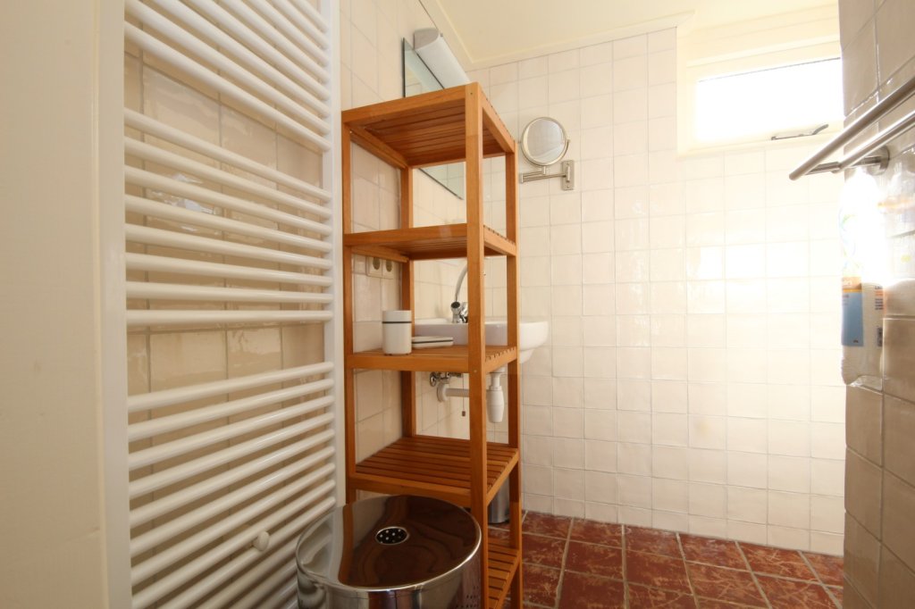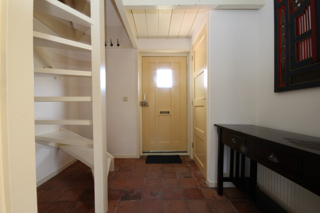 Begane grond: entree, hal, lichte woonkamer met zithoek, woonkeuken voorzien van alle gemakken (vaatwasser, koelkast, oven, gaskookplaat), slaap/werkkamer met bergzolder, badkamer met inloopdouche, wastafel en radiator, toilet apart, vanuit de hal een vaste trap naar de eerste verdieping.