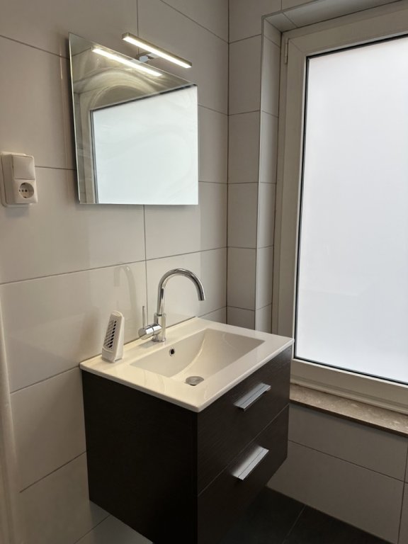 Naast de keuken vindt men een badkamer (ca. 4m2) voorzien van douche, wastafelmeubel en zwevend toilet.