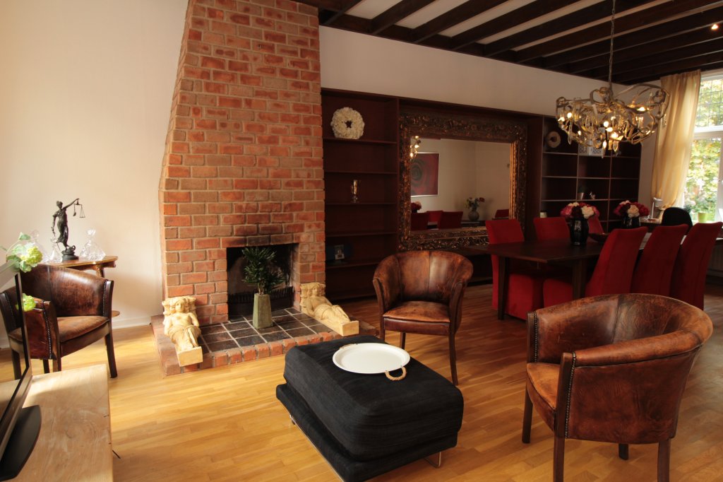 Eerste verdieping: royale woonkamer, studeerkamer, keuken (voorzien van diverse apparatuur) en toegang tot het balkon en badkamer