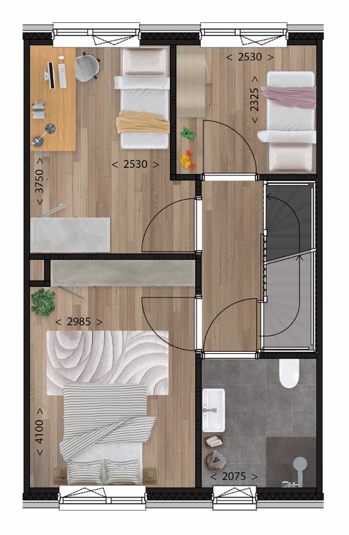 Eerste verdieping: overloop, drie slaapkamers van ca. 12, 10 en 6 m2, nette badkamer (ca. 4,5 m2) met douche, tweede toilet en vaste wastafel.