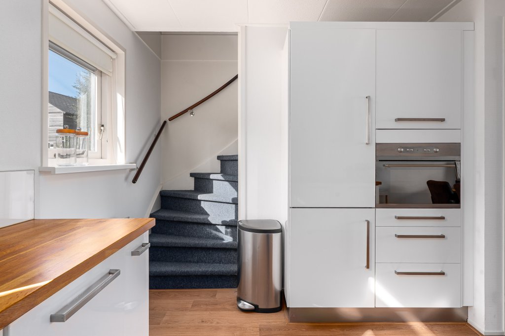 Entree, hal, meterkast, toilet met fonteintje. Lichte woonkamer met hoekbank en openslaande deuren naar de achtertuin. Smart TV en Netflix. Open keuken voorzien van vaatwasmachine, inductie kookplaat, ovenmagnetroncombinatie, afzuigkap en koelkast met 3 vriesvakken en trapopgang naar eerste verdieping. Er ligt laminaat op de gehele begane grond.