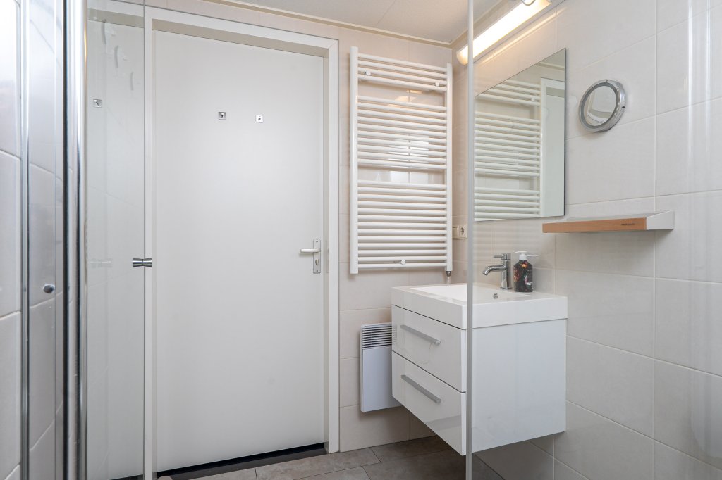 Via de trap bereik je de overloop op de eerste etage met twee tweepersoonsslaapkamers. Derde slaapkamer is als kastenkamer/werkkamer in gebruik. Gangkast voorzien van een boiler-, wasmachine, droger, strijkplank en -ijzer. In de kamers en overloop ligt zeer kortpolig tapijt. Lichte badkamer voorzien van extra ruime douche, tweede toilet, wastafelmeubel en designradiator.