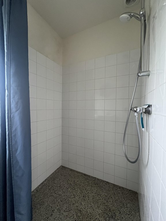 2 bedrooms and a studyroom. Bathroom with shower, sink, and radiator.