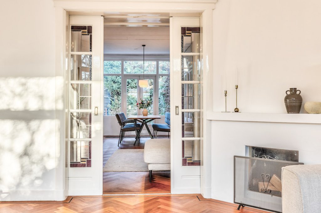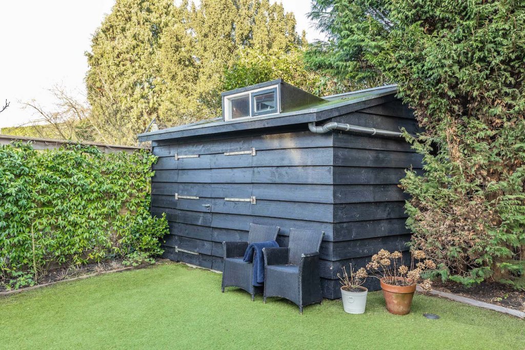 Spacious front garden, entrance hall, toilet and staircase. Access to the bright and spacious living room with a fireplace with open connection to the spacious dining room which also has a fireplace with adjacent kitchen with appliances. The French doors give access from the dining room to the deep garden. The kitchen also has a Dutch door to the garden. The backyard offers sun until it sets. Also, there is a large detached garden shed.