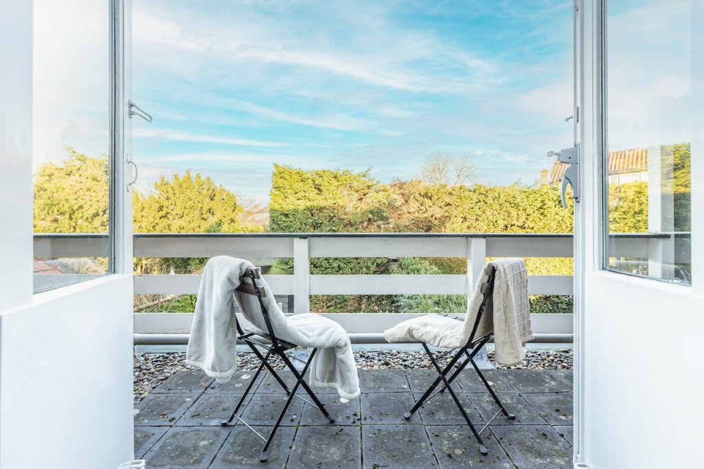 Stairs to spacious second floor with 2 large and 1 smaller bedroom. Both large bedrooms have French doors opening to a balcony. Bathroom with washbasin, bathtub and separate shower. Seperate toilet.