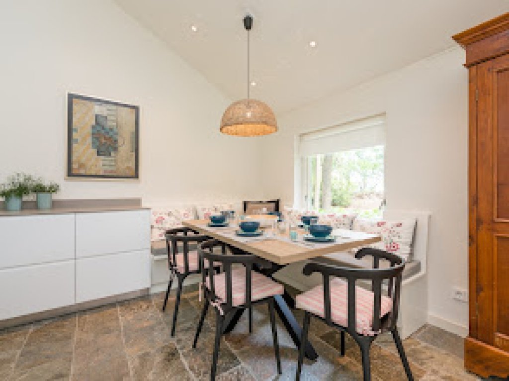 De sfeervolle woonkamer is uitgerust met een moderne houtkachel. Via openslaande deuren heeft u toegang tot het zonnige terras. De luxe open keuken beschikt over hoogwaardige inbouwapparatuur, een inductiekookplaat, inbouw oven en magnetron. De gezellige zithoek waar je uitgebereid kunt dineren.