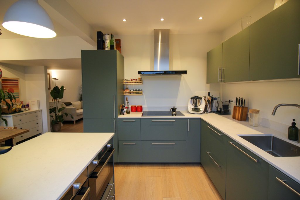Nieuwe open keuken (2024), voorzien van alle benodigde apparatuur zoals vaatwasser, inductiekookplaat, afzuigkap, combi-oven en koel/vriescombinatie.