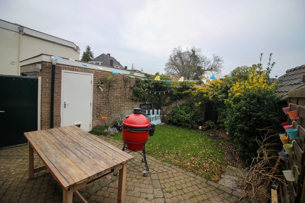Achter in de tuin bevindt zich de ruime schuur. De tuin heeft tot slot ook een praktische ‘achterom’.