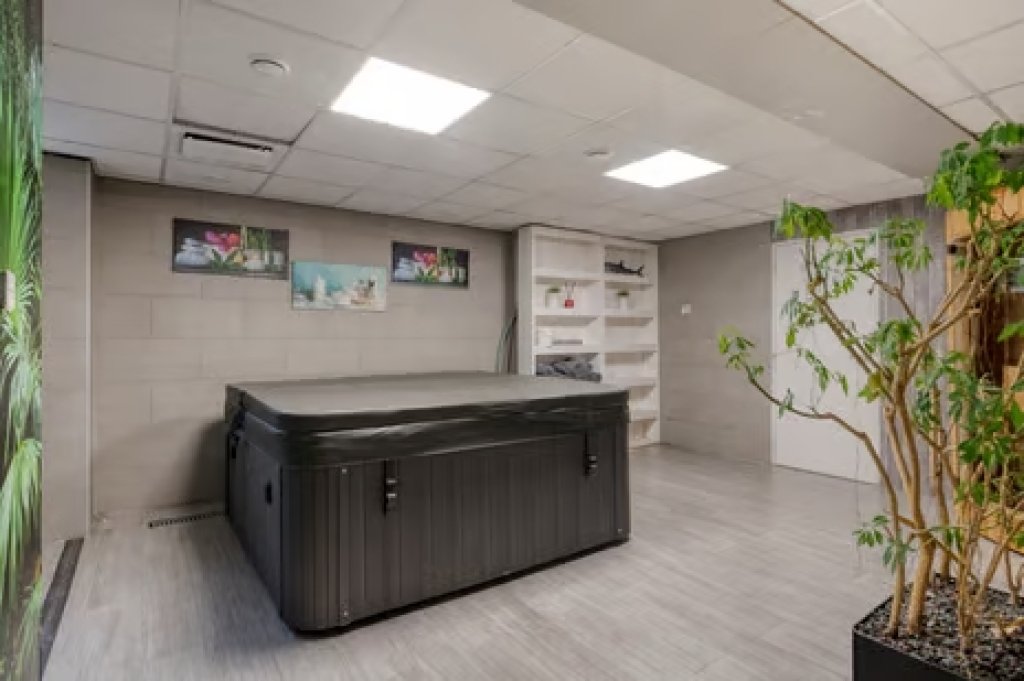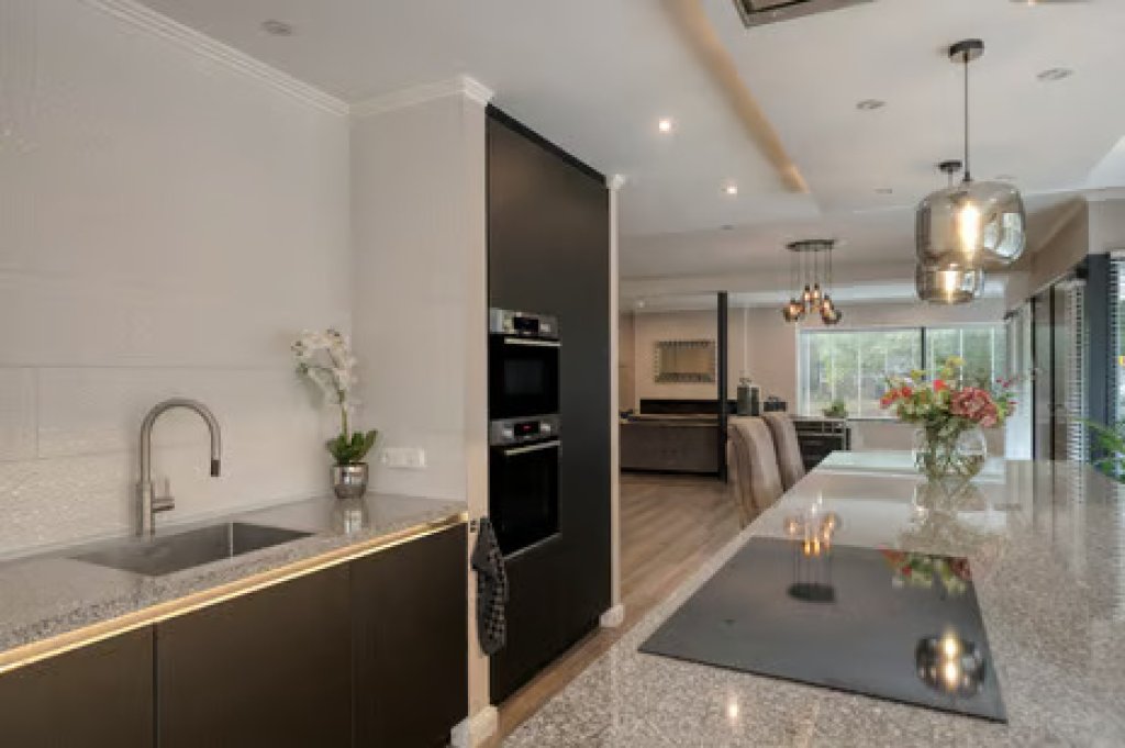Begane grond; entree, keuken die voorzien is van kookeiland met inductieplaat, granieten werkblad met ingebouwde stopcontacten, vaatwasser, combi-oven, afzuigkap, quooker en een amerikaanse koelkast. De woonkamer heeft meerdere zithoeken met een split-level indeling. Met een glazen schuifwand kun je de ruimtes naar wens openen of afsluiten. Op het hogere niveau is een royale zitkamer, slaapkamer met badkamer en suite, en een extra kamer. In het souterrain vind je een sfeervolle bar, welnesshoek met suana en jacuzzi en een extra kamer. Ook is er een ruime kelder.
