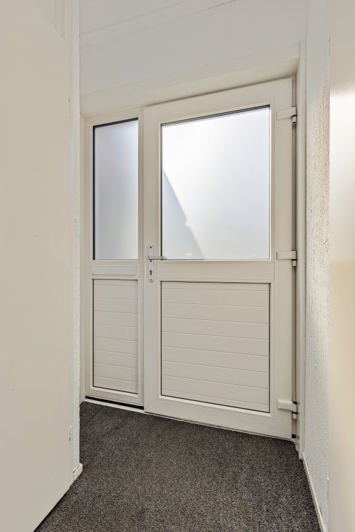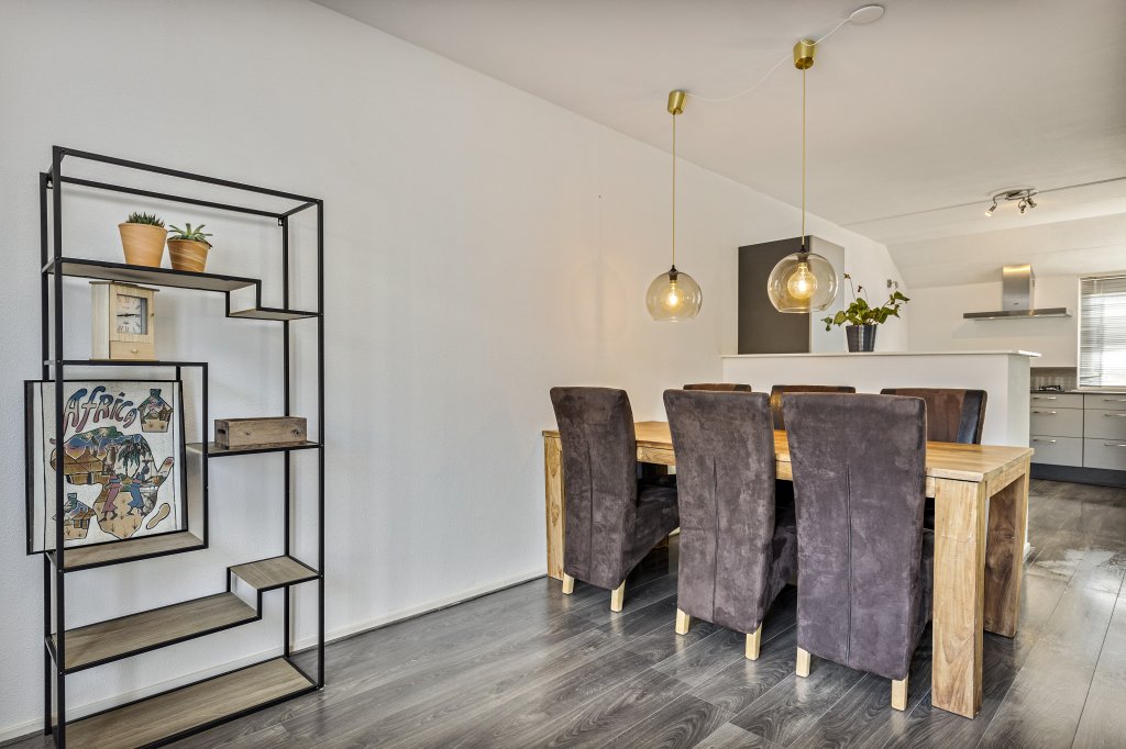 De entreehal biedt toegang tot het toilet, de woonkamer en de open trap naar de eerste verdieping. De ruime woonkamer is tuingericht en via de dubbele deuren heeft u toegang tot de tuin. Door de grote glaspartijen aan de achterzijde is de woonkamer heerlijk licht.