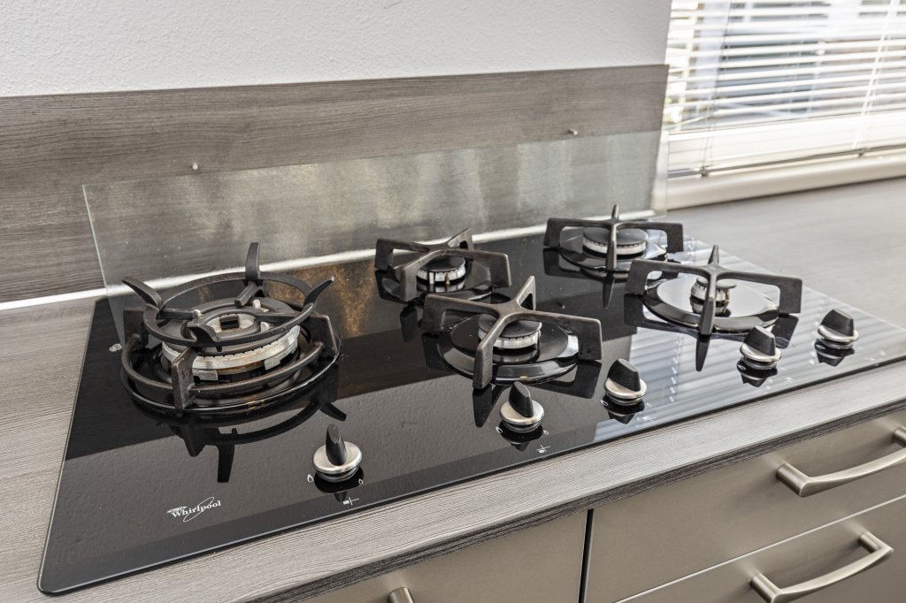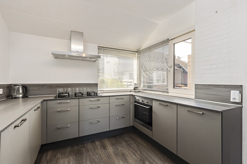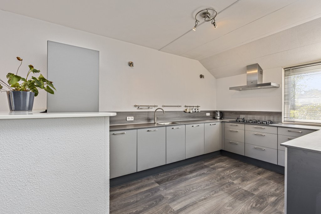 De keuken is gelegen aan de voorzijde van de woning en heeft een U-vormige unit. De moderne keuken heeft een lichtkleurig blad en is voorzien van een oven, 5- pits gasfornuis, koelkast en vaatwasser.