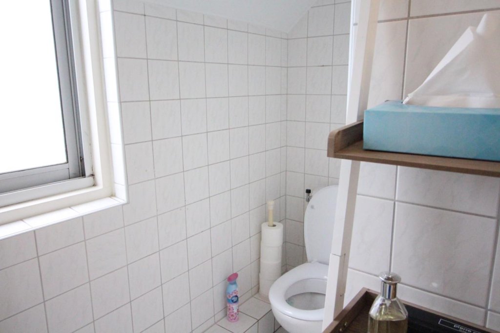 Badkamer met douchecabine, wastafel en toilet