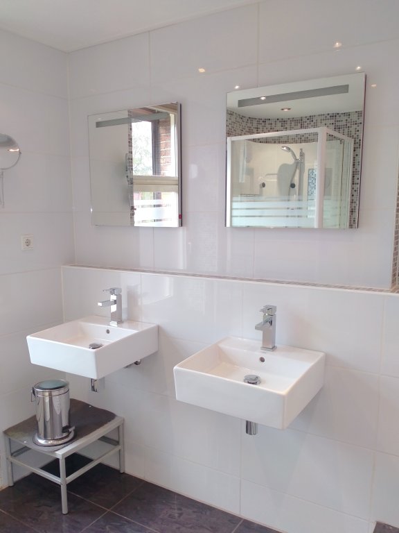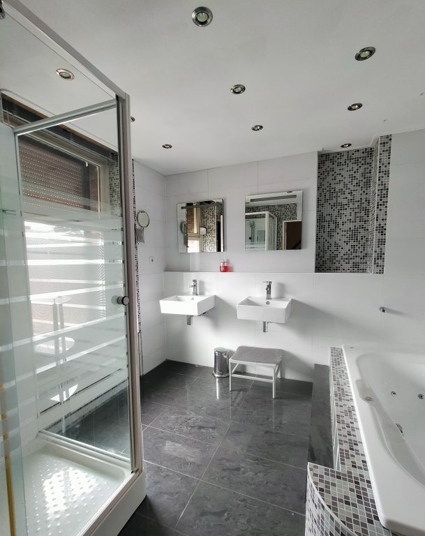 Overloop met een opbergkast, een zeer ruime slaapkamer met zicht op de tuin en een modern gerenoveerde badkamer met massage-douche cabine, een bubbelbad, een tweede toilet en twee wastafels.