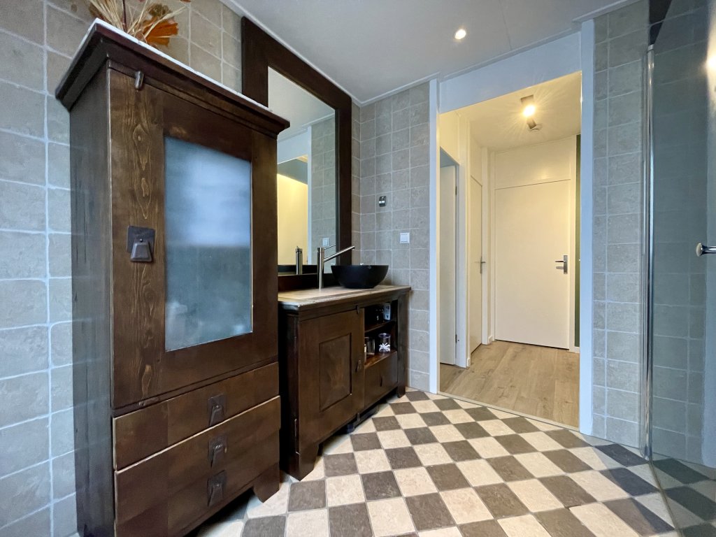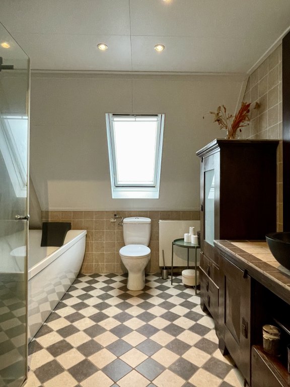 Een stijlvolle badkamer met wastafelmeubel, toilet, ligbad én een inloopdouche;