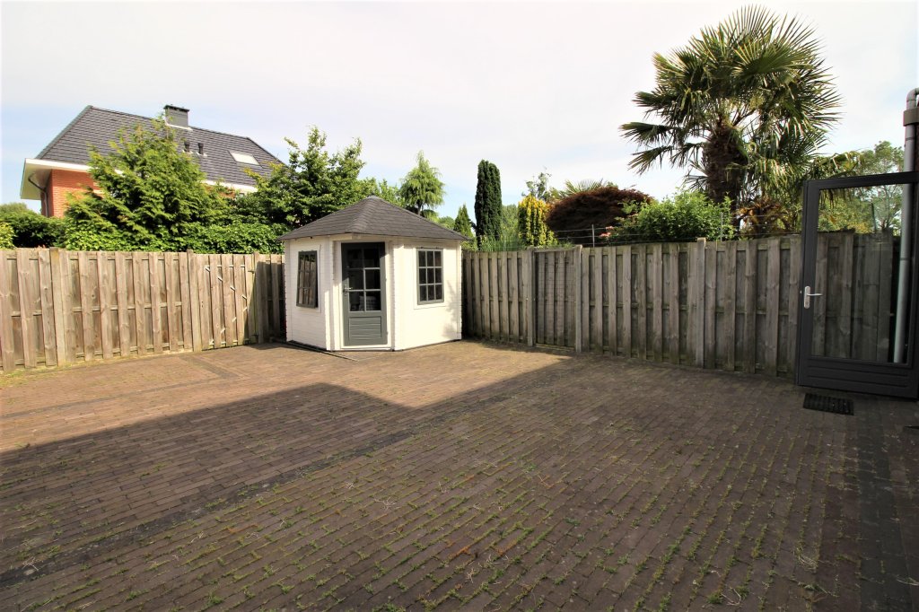De ruime betegelde tuin beschikt over een tuinhuisje.