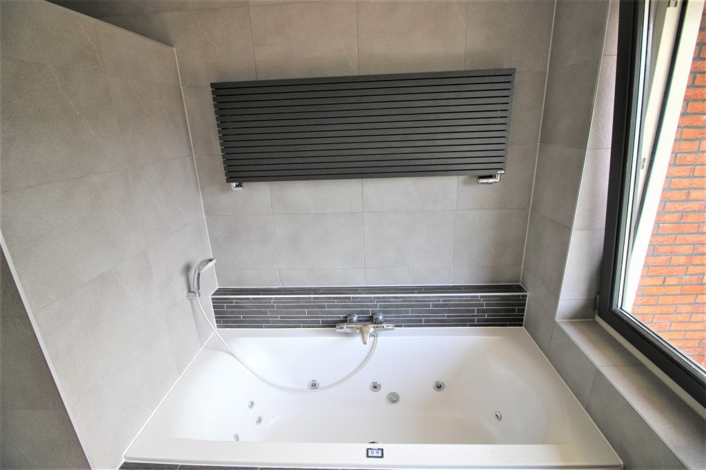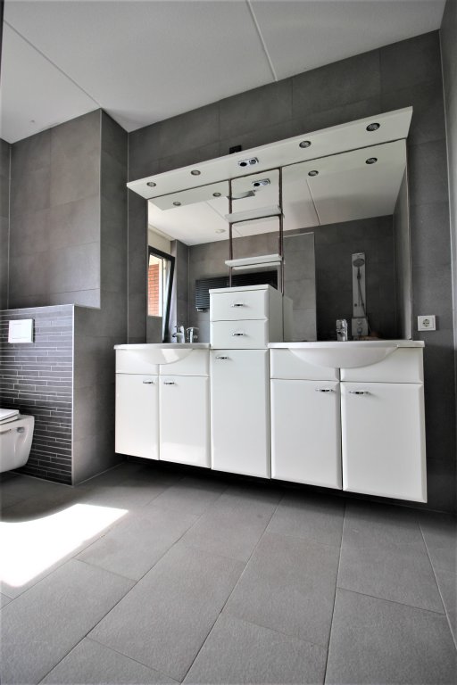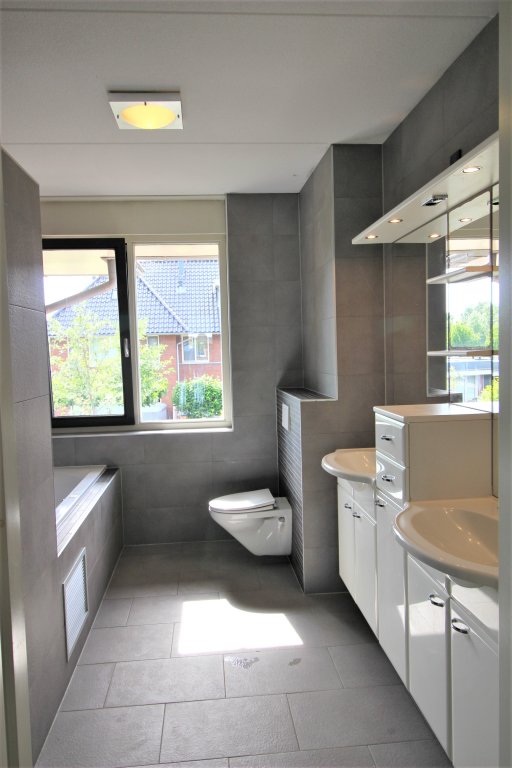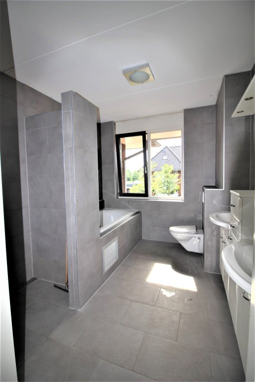 De badkamer is voorzien van een ligbad, separate inloopdouche, vrij hangend toilet, 2 wastafels en een raam voor natuurlijk lichtinval en ventilatie.