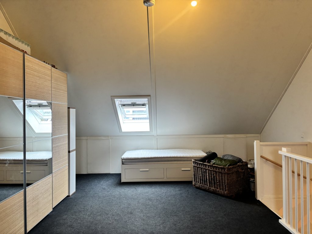 2e Verdieping: een ruime zolder met wasmachine en droger, fijne werkplek en een extra logeerbed.