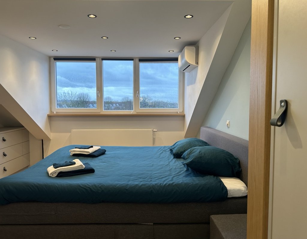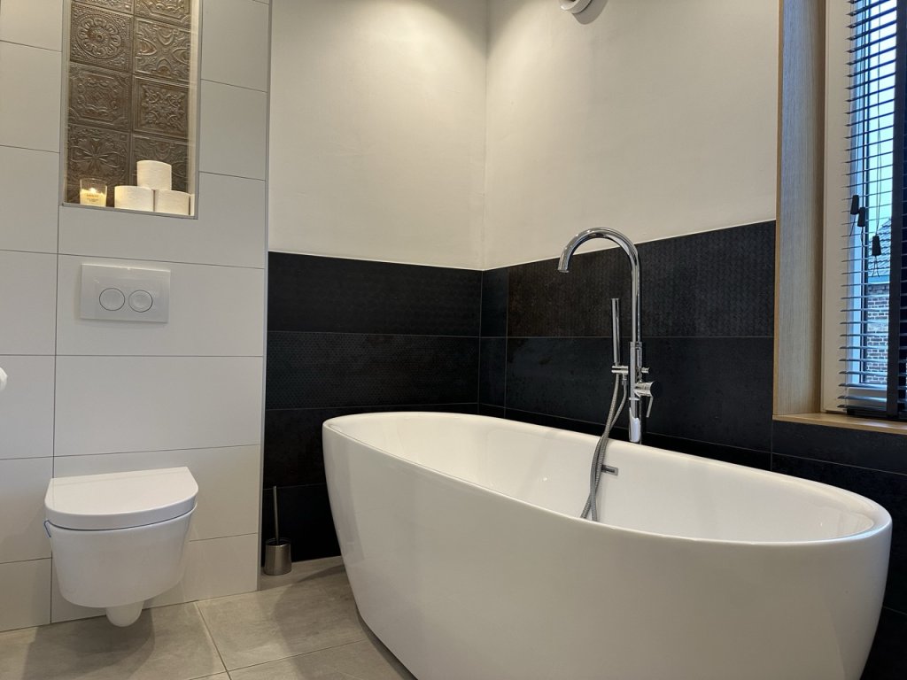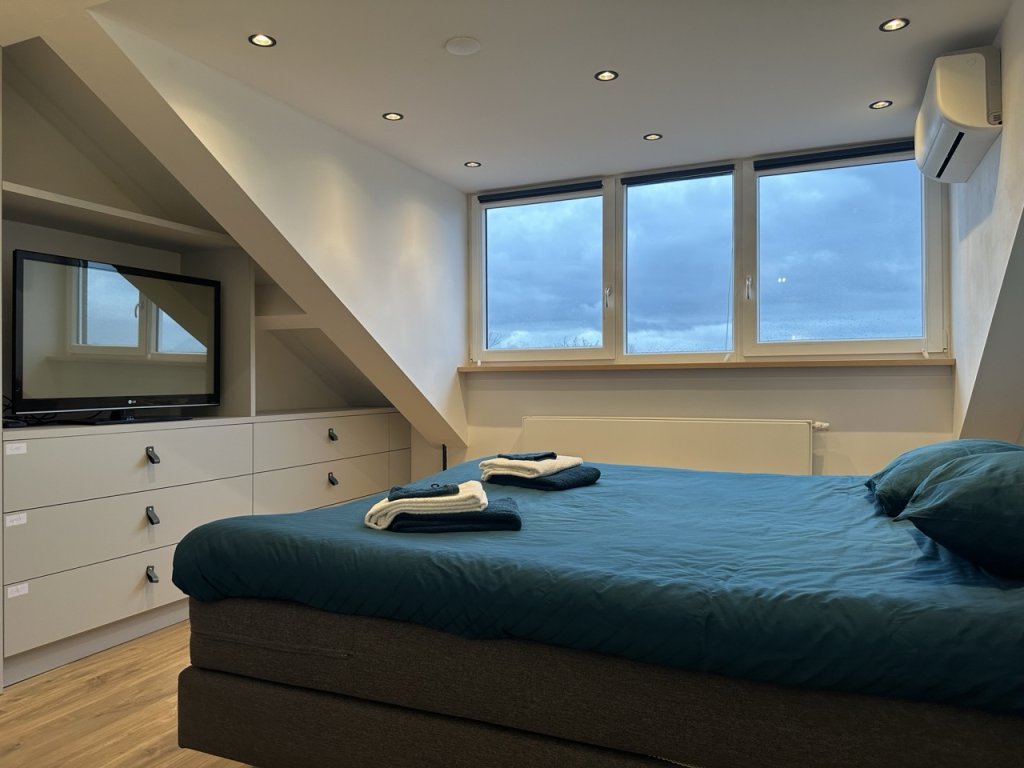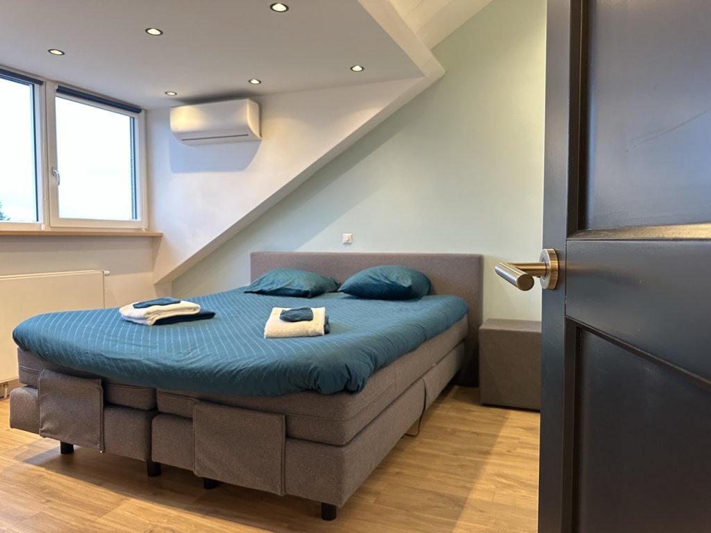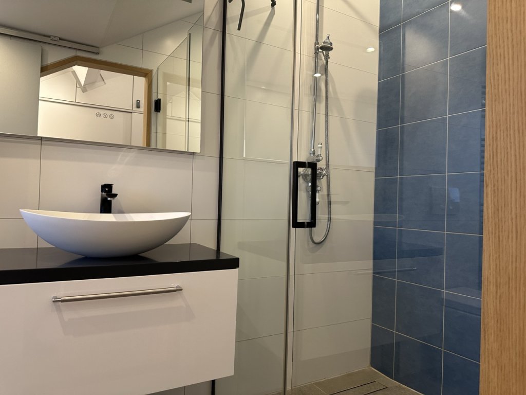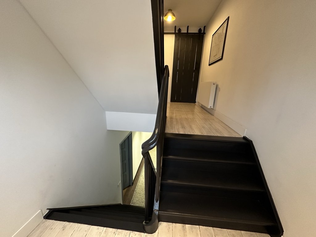 Wanneer u de eerste verdieping bereikt, opent een mooie houten schuifdeur de toegang naar de badkamer. Deze moderne badkamer is voorzien van designkranen, een inloopdouche, een zwevend toilet en een losstaand bad. Via de overloop bereikt u twee ruime slaapkamers, ieder van ramen, kasten en bedden voorzien.