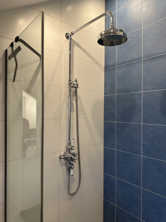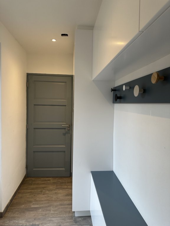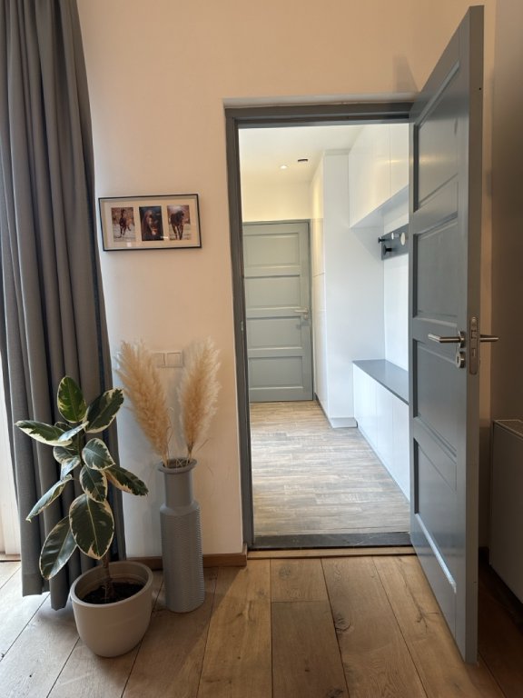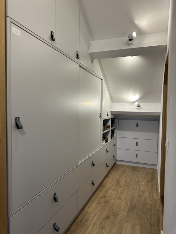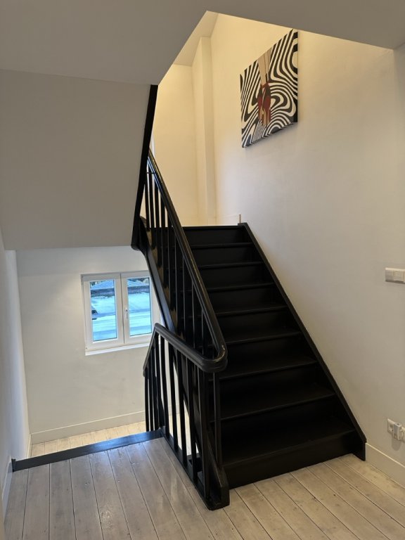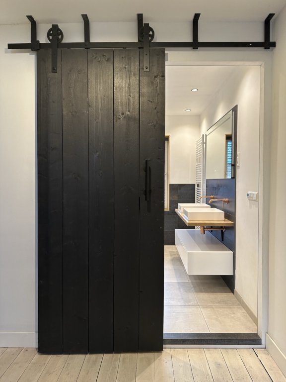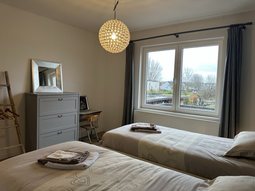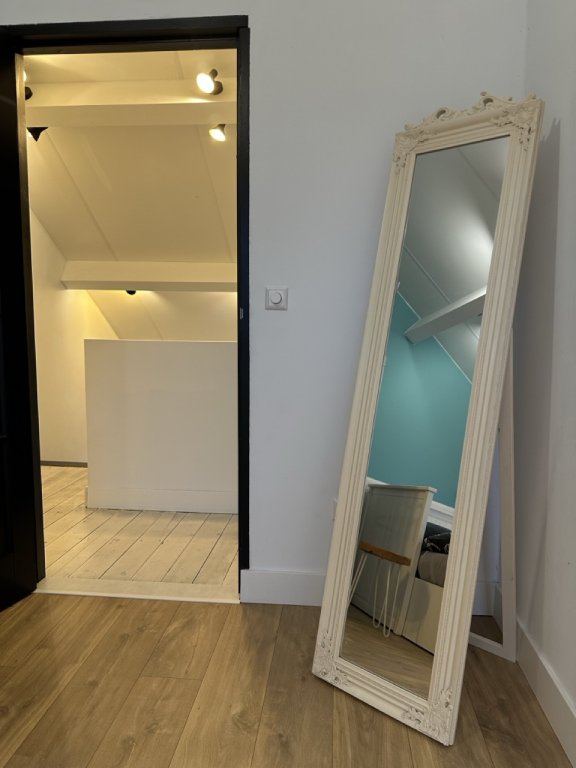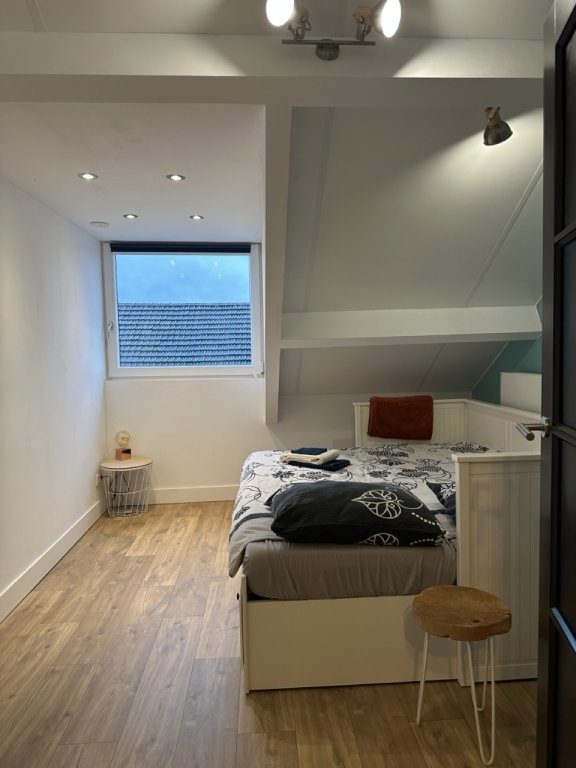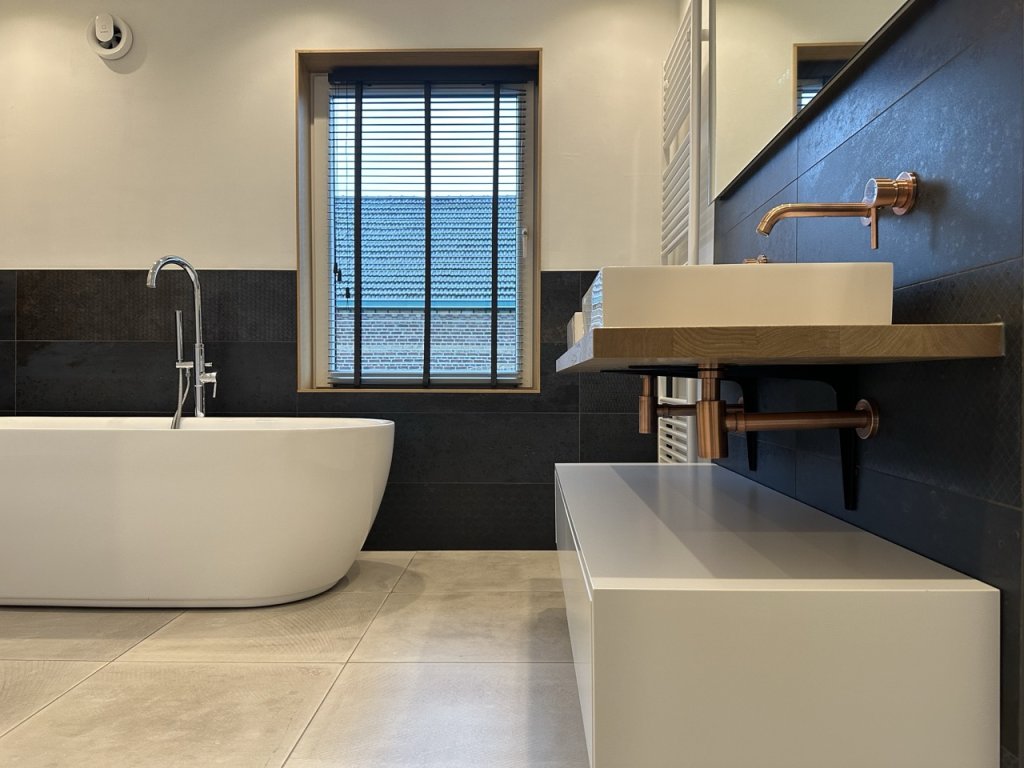 Wanneer u de eerste verdieping bereikt, opent een mooie houten schuifdeur de toegang naar de badkamer. Deze moderne badkamer is voorzien van designkranen, een inloopdouche, een zwevend toilet en een losstaand bad. Via de overloop bereikt u twee ruime slaapkamers, ieder van ramen, kasten en bedden voorzien.