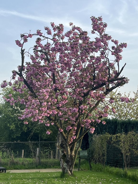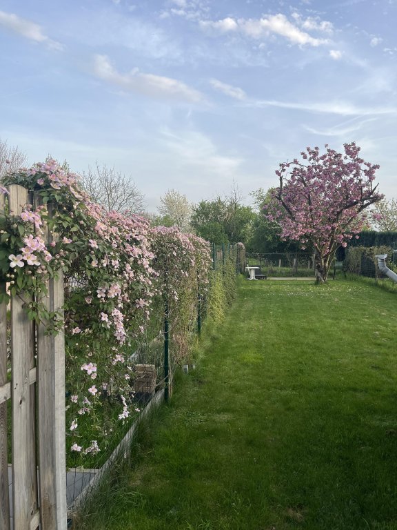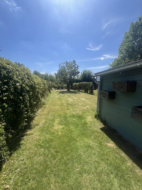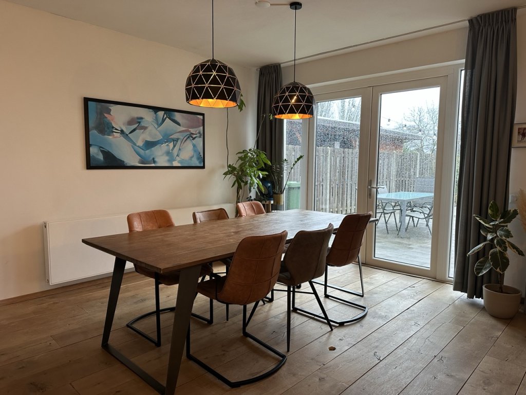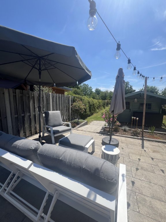 De achtertuin van deze woning is groot en uitgestrekt. Direct achter het huis ligt een terras voorzien van tuinmeubels. Een leuk tuinhuisje markeert de scheiding tussen het terras en het langgerekte grasveld. Achterin de tuin staat een mooie boom die bloesemt in het voorjaar. Ook heeft u in deze tijd van het jaar een stel wollige achterburen: de grond achter de tuin is gemeentelijke grond en fungeert soms als schapenweide.