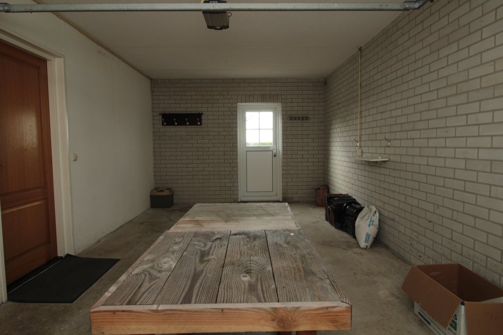 Er is een inpandige garage met een elektrische deur en royale tuin rondom de woning.