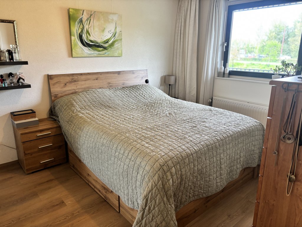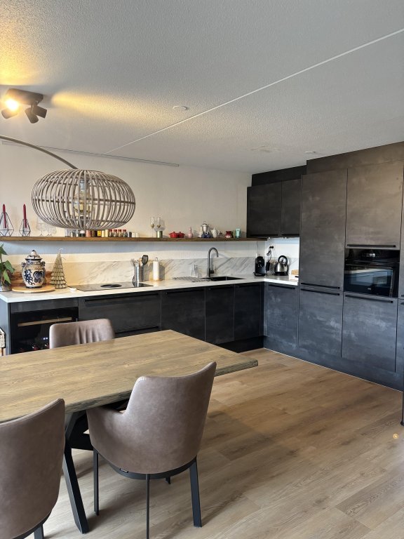 De badkamer in lichte kleurstelling beschikt over een inloopdouche, wastafel en toegang naar de praktische wasruimte. Het toilet is los van de badkamer gesitueerd in de hal. De ruime woonkamer is circa 36 m2 groot, samen met de keuken en heeft veel natuurlijke lichtinval vanwege de grote raampartijen. De moderne keuken is voorzien van een inductie kookplaat, koelkast, vriezer en klimaatkast.