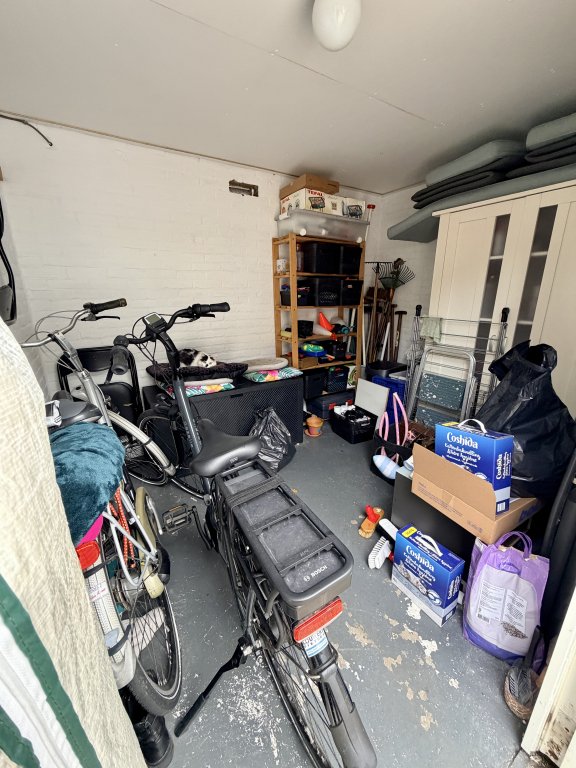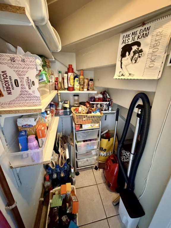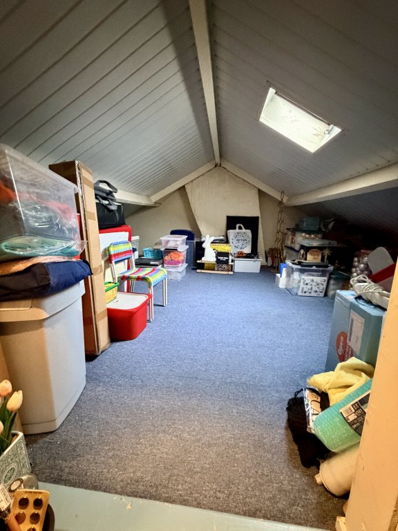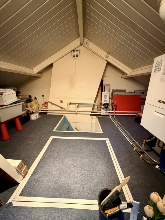 Via een houten trap is de zolder toegankelijk. Hier vindt met o.a. de CV-ketel en veel ruimte voor opslag of een speelkamer voor de kinderen.