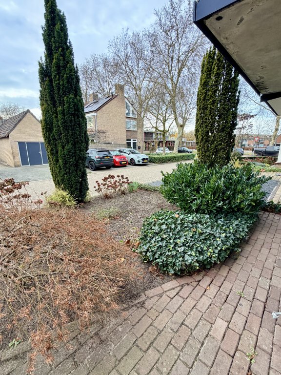 De voortuin is mooi aangelegd met enkele borders met volwassen en deels groenblijvende beplanting. Het is tevens een goed onderhouden en ruime voortuin met een buitenkraan. Het geheel is gelegen aan een aangenaam rustige woonstraat voor bestemmingsverkeer in een gewilde en kindvriendelijke woonomgeving met op openbaar terrein ruim voldoende parkeergelegenheid. Op steenworp afstand bevindt zich het winkelcentrum ‘De Poort’ en een basisschool.