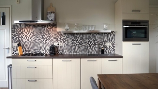 Via de gezamenlijke tuin neemt u de trap die ons brengt naar het appartement. Via de voordeur komt u in de hal waar het toilet en de meterkast zich bevinden. Via de hal komen we in de woonkamer met open keuken. De wanden zijn strak gestuukt en op de vloer ligt een lichte laminaatvloer. De keuken is voorzien van ingebouwde vaatwasser, koel/vries combinatie, 4 pits gasplaat, en een combi oven. Vanuit de woonkamer kijkt u uit op de appel en peren boomgaard en de monumentale kerk uit het jaar 1511.