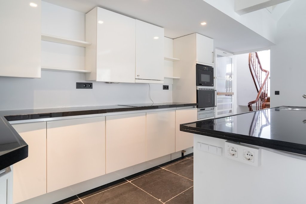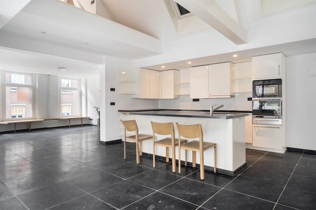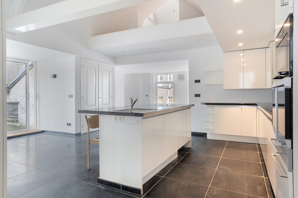 Eerste etage: Via de trapopgnag bereikt u het appartement. U komt binnen in een ruime woonkamer met een open leefkeuken. De keuken is volledig uitgerust met hoogwaardige apparatuur, waaronder een oven, steamer, vaatwasser, inductiekookplaat met vijf pitten en een combinatie van oven-vriesvak.