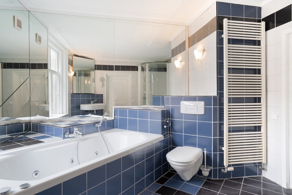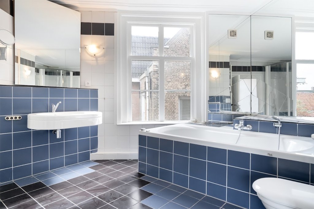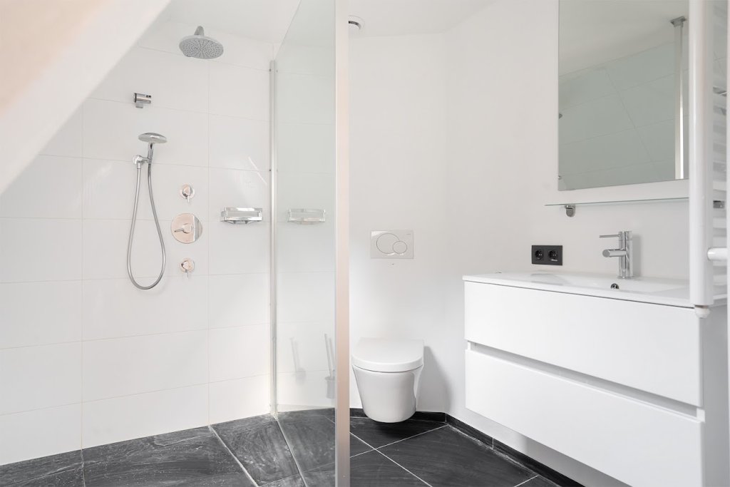 Begane grond: Aan de achterzijde van het appartement vindt u de tweede riante slaapkamer (ca 30m2) . Deze heeft een eigen badkamer met bad, douchecabine, wasmeubel en toilet.