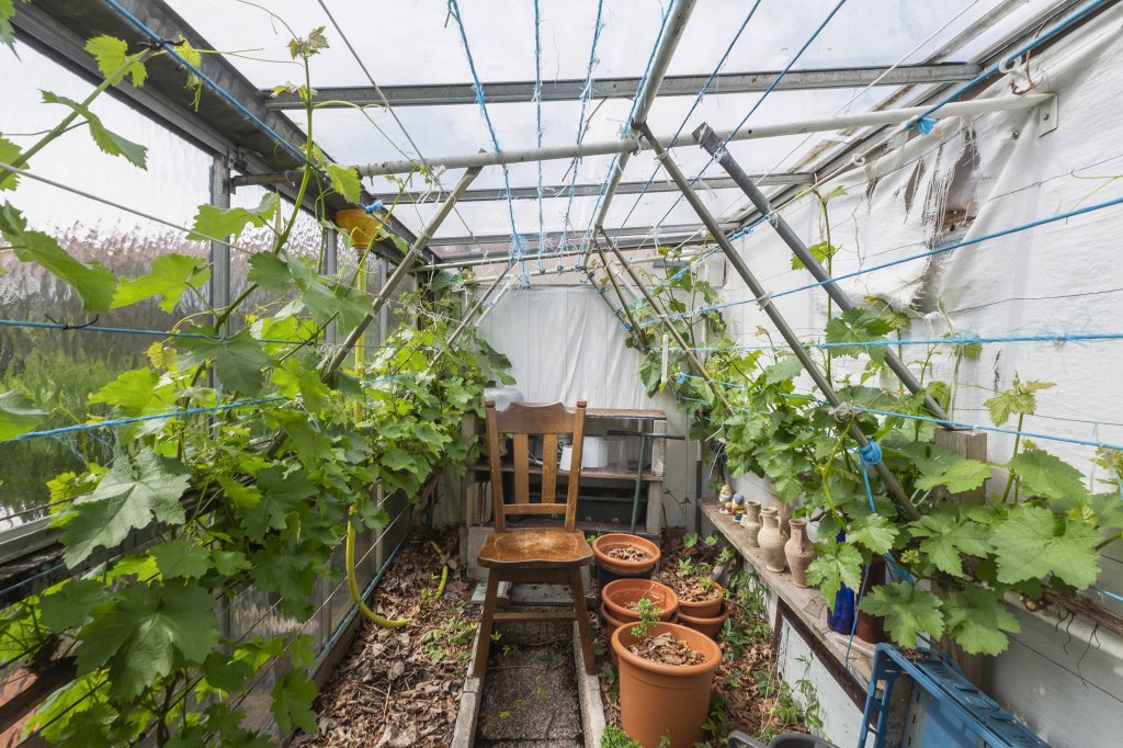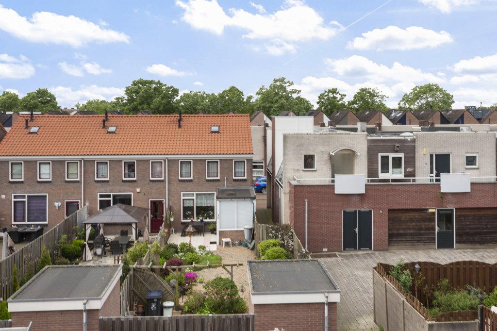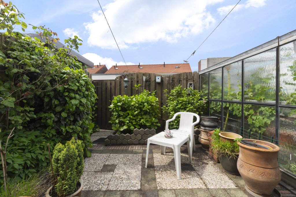 Vanuit de bijkeuken gaat u vervolgens naar de ruime achtertuin met achterom en een schuur voor bijvoorbeeld fietsen en een apart druivenhok. Door de gunstige ligging heeft u hier de hele dag zon.