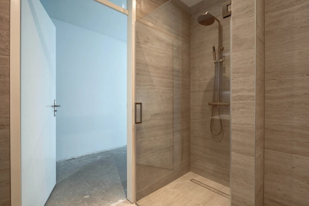 De luxe ingerichte badkamer is geheel betegeld, voorzien van vloerverwarming, hangend toilet, een inloopdouche, dubbele wastafel en een wandspiegel met inbouwverlichting en verwarming.