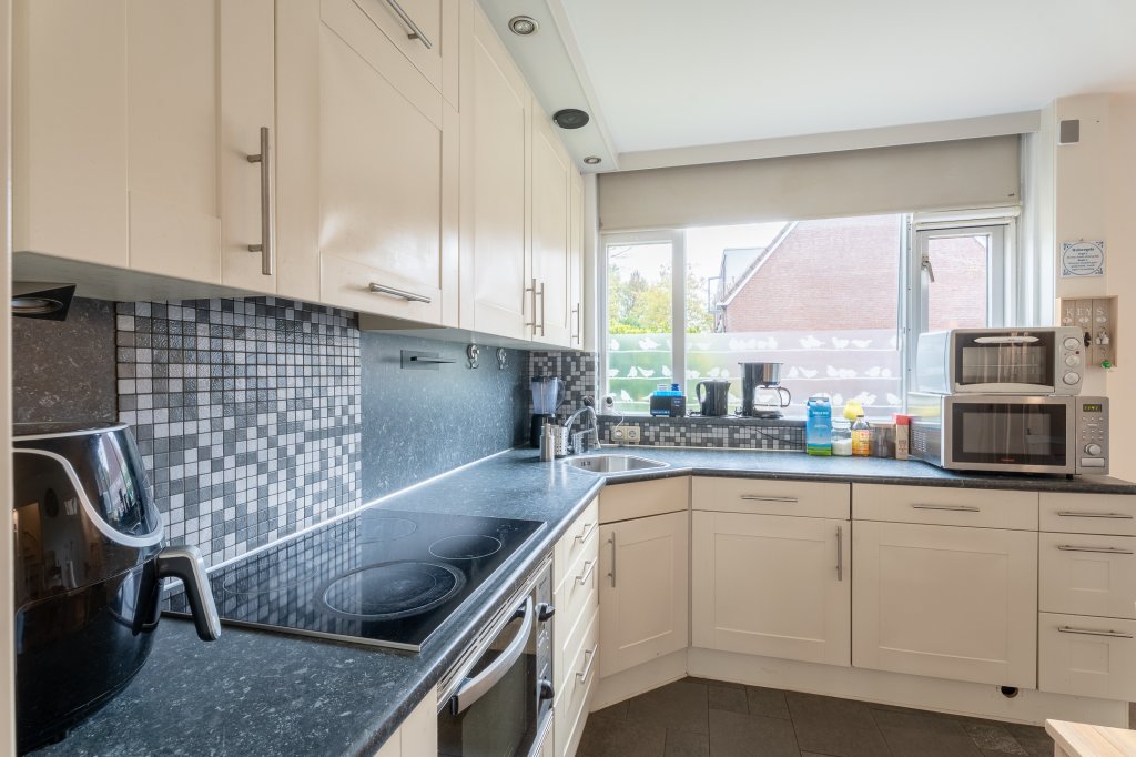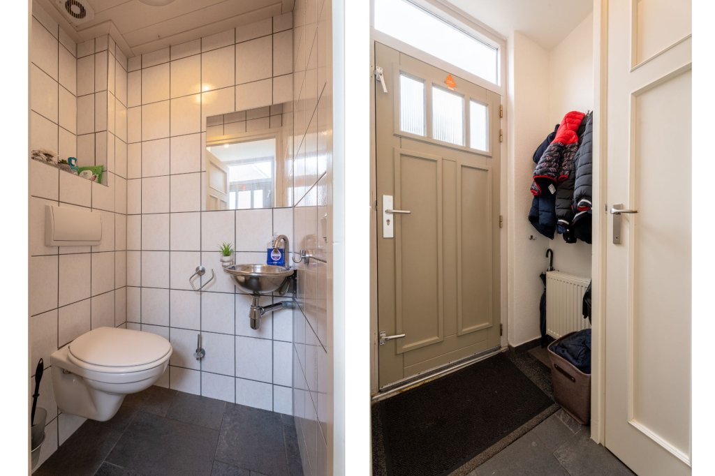 Aankomst in de hal met meterkast, toilet met fonteintje. Je betreedt de lichte woonkeuken met 4 pits kookplaat, vaatwasser, afzuigkap en opbergruimte boven en onder, in de keuken is de trapopgang naar boven en gezellige schuifdeuren naar de woonkamer. De woning is voorzien van een laminaatvloer.