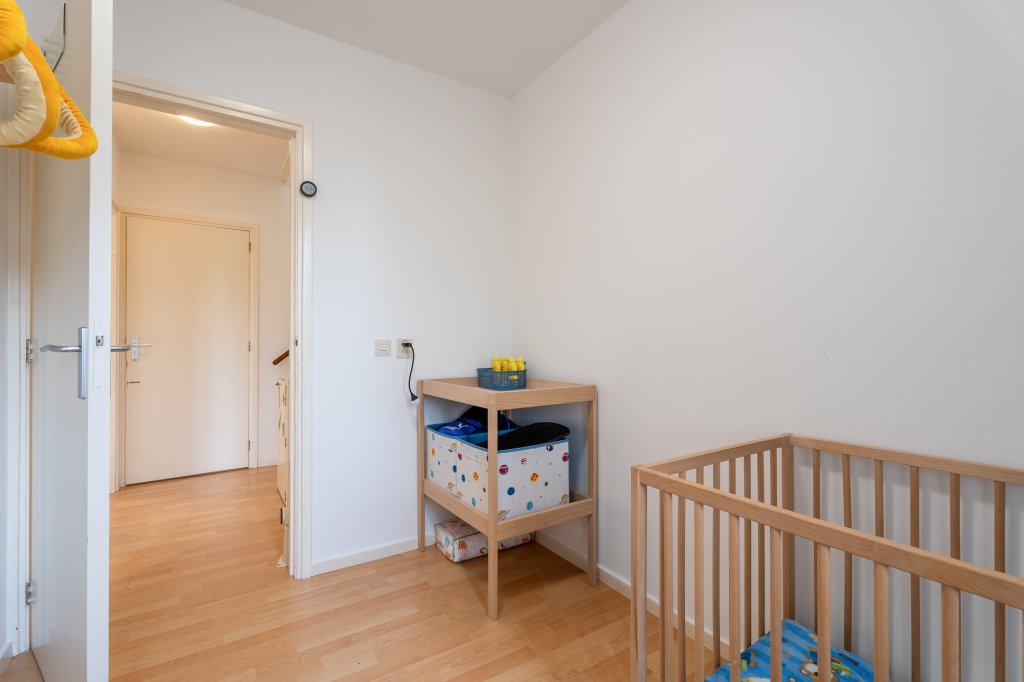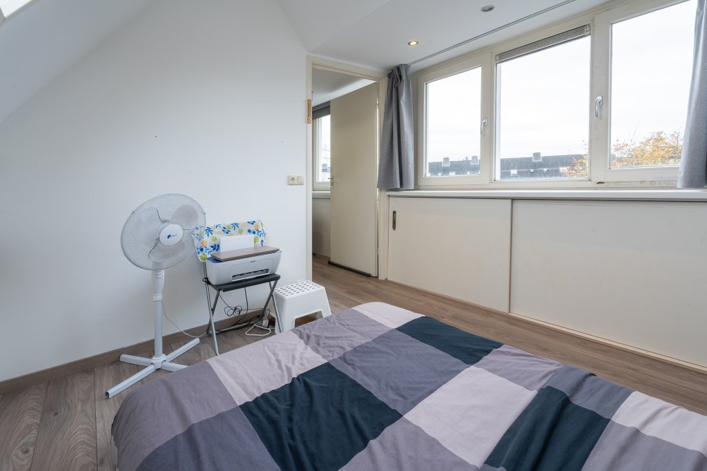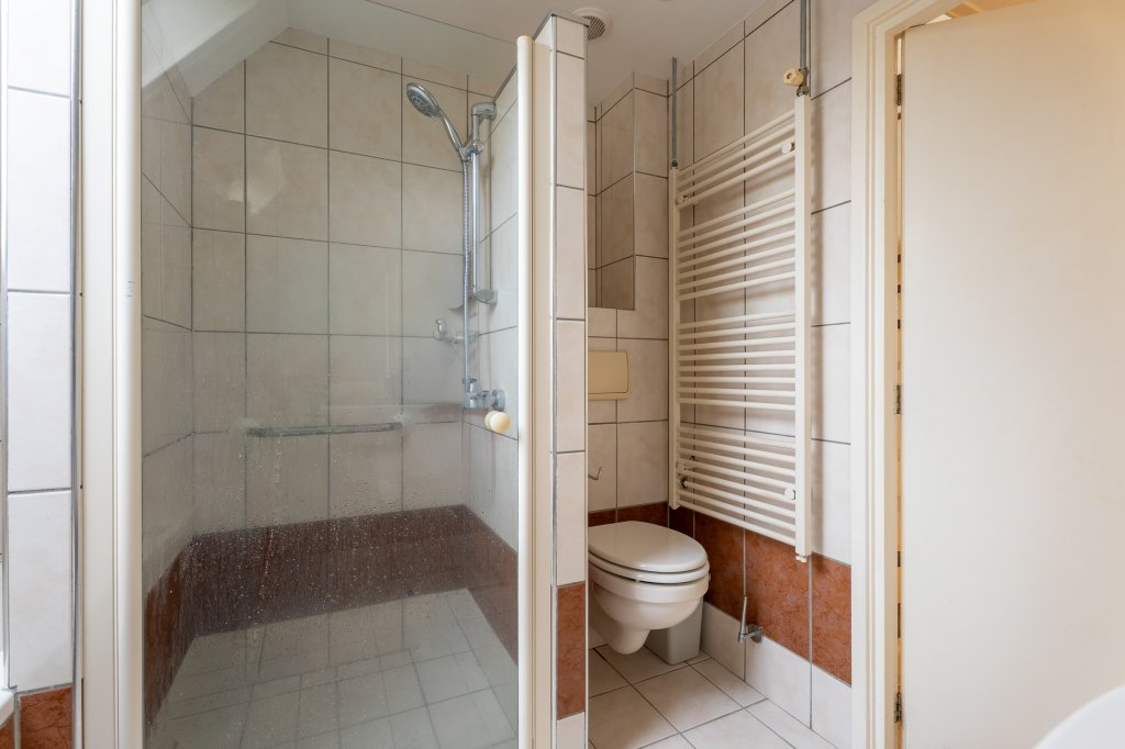 Overloop met vaste trap naar de zolder, twee slaapkamers aan de achterzijde, een slaapkamer aan de voorzijde, badkamer voorzien van wastafel, bad, douche combinatie, tweede toilet, wasmachineaansluiting en dakraam.