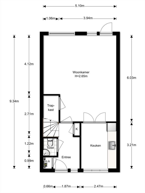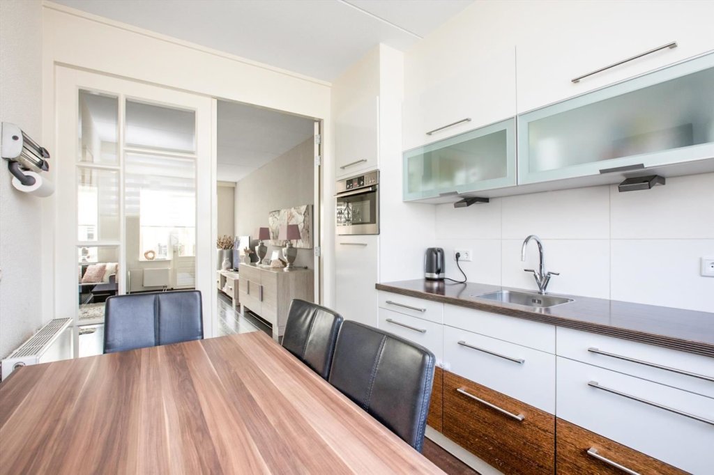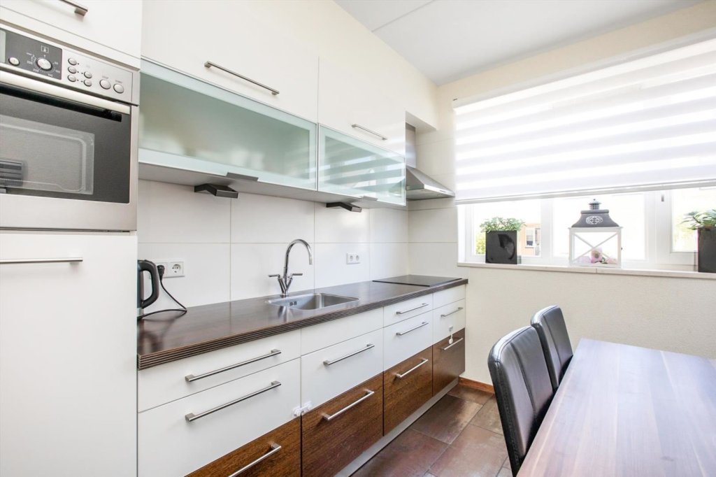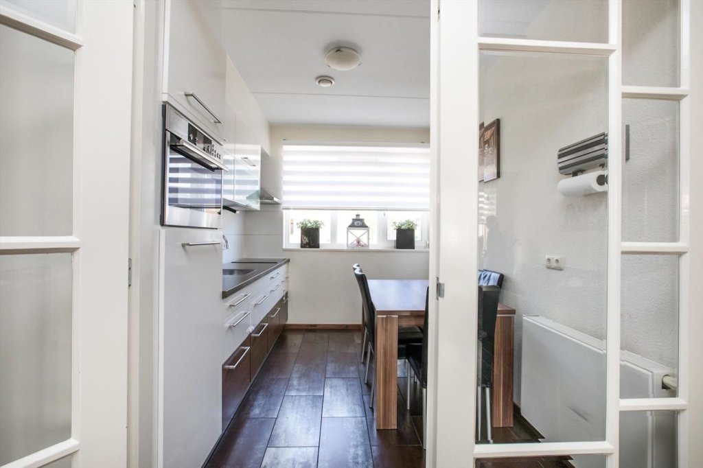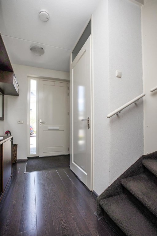 entree, hal met meterkast, garderobenis, toilet met fontein, trapopgang, woonkamer met mooie laminaatvloer, trapkast en toegang tot tuin met lichtdoorlatende veranda, gesloten keuken voorzien van vaatwasser, 4-pits inductiekookplaat, afzuigkap, combimagnetron en koelkast.