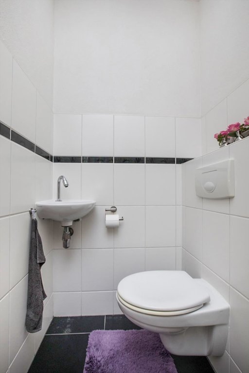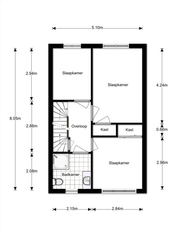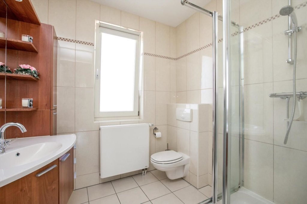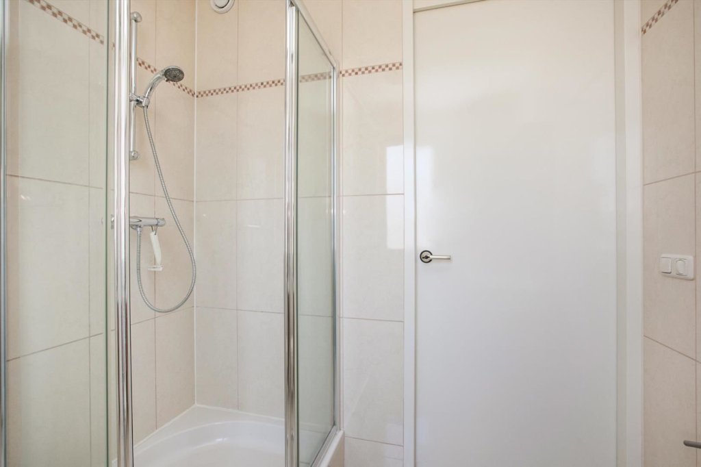 overloop, 3 slaapkamers waarvan 2 met vaste kast, geheel betegelde badkamer met douche, badmeubel, radiator en 2e toilet.