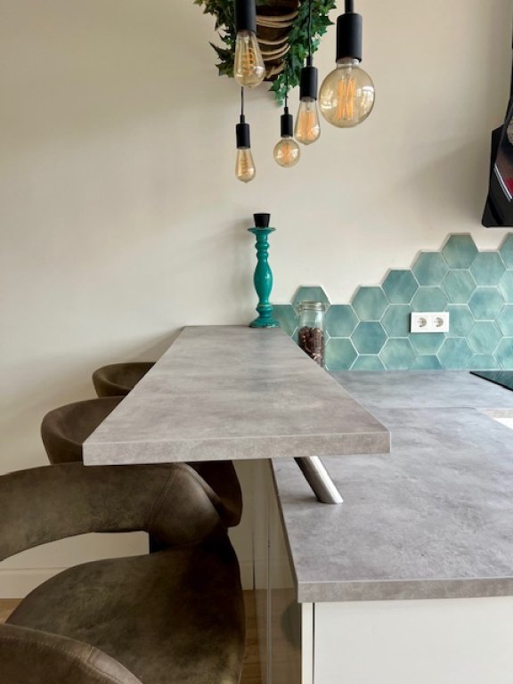 - Keuken: moderne keuken, bestaande uit twee keukenblokken. Voorzien van oven, vaatwasser, koelkast en inductiekookplaat.