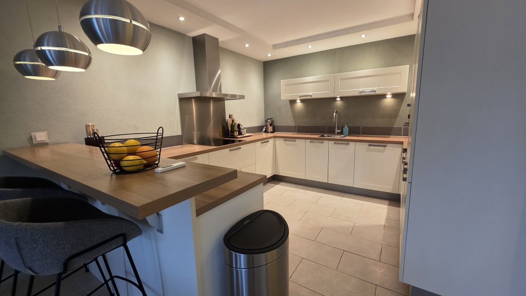 At the end of the hall, you enter the spacious, garden-facing living room with an open-plan kitchen. The kitchen is designed in a practical U-shape and features all modern amenities, including a refrigerator with freezer, combination oven, dishwasher, and induction cooktop. The generous countertop and ample storage space make this kitchen very well-equipped.